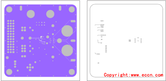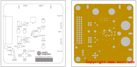 圖9. 評(píng)估系統(tǒng)MAX98380 EVS PCB設(shè)計(jì)圖:左:層5;右:底層絲印 |