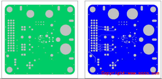 圖8. 評(píng)估系統(tǒng)MAX98380 EVS PCB設(shè)計(jì)圖:左:層4;右:底層