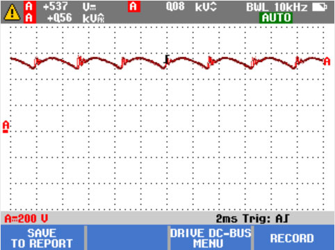 驅(qū)動器內(nèi)部的交流-直流轉(zhuǎn)換至關(guān)重要。為獲得最佳驅(qū)動器性能,必須要保證電壓正確、充分濾波并保持低紋波水平。高波紋電壓可能說明電容器存在故障或所連接電機(jī)的規(guī)格不正確。Fluke MDA-500 系列 Motor Drive Analyzer 的記錄功能可在承受負(fù)載時的工作模式下對直流總線的性能進(jìn)行動態(tài)檢查。還可以使用 Fluke ScopeMeter® Test Tool 或高級萬用表進(jìn)行此測試。