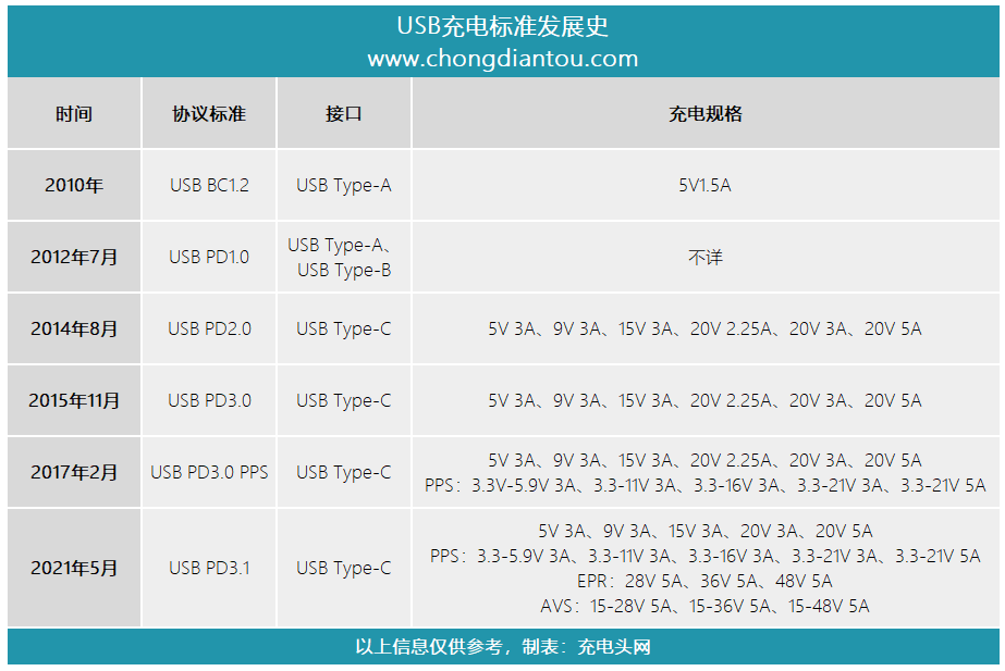 USB PD快充標(biāo)準(zhǔn)發(fā)展至今,已經(jīng)走過(guò)了近十年的時(shí)光,期間也經(jīng)歷了多次標(biāo)志性的迭代。其中,USB PD2.0是真正量產(chǎn)商用的快充標(biāo)準(zhǔn),也為實(shí)現(xiàn)USB PD快充大一統(tǒng)奠定了基礎(chǔ)。USB PD3.0則更多是在協(xié)議識(shí)別功能方面做了更新,充電規(guī)格并沒(méi)有改變。