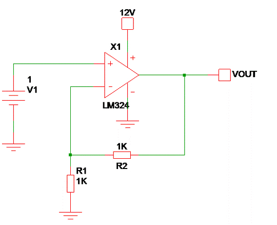 下面的電路是著名的非反相運算放大器拓撲,它具有 1V 輸入和 R1 = R2 = 1KΩ 的增益電阻。它有一些定義的方程,以便找到輸入和輸出電壓關(guān)系之間的關(guān)系。我們可以應(yīng)用基本運算放大器規(guī)則來查找輸出電壓,而不是使用那些定義的公式。
