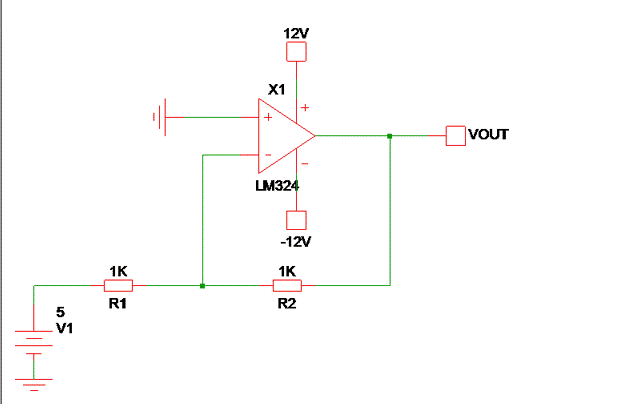 在此反相輸入配置中,反相輸入總是在“地電位”處提及(由于非反相輸入地電位),由于運算放大器的內(nèi)部功能,它沒有與地直接連接。即使反相輸入由 5V 電源供電,反相端電壓也等于“Gnd”,這就是將其稱為“虛擬接地”或“虛擬接地”的原因。