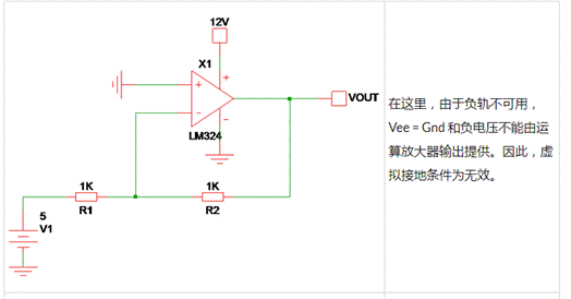 在某些閉環(huán)條件下,當(dāng)輸出匹配限制超過運算放大器 Vcc 和 Vee 電源范圍時,虛擬接地和虛擬短路概念也將失效。