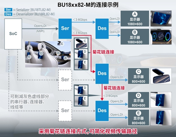 新產(chǎn)品“BU18xx82-M”符合汽車(chē)電子產(chǎn)品可靠性標(biāo)準(zhǔn)AEC-Q100,可確保車(chē)載應(yīng)用所需的高可靠性。另外,串行器“BU18TL82-M”支持輸入接口OpenLDI和MIPI-DSI,因此適用于各種SoC。