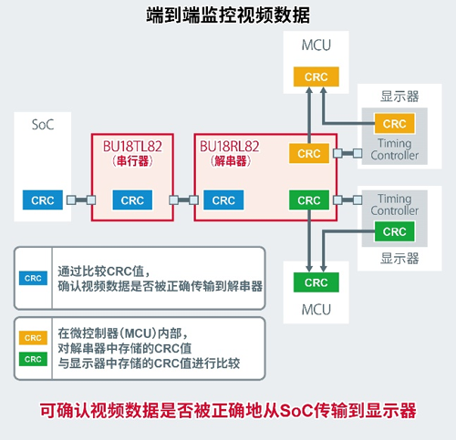 普通的SerDes IC需要成對(duì)連接串行器和解串器才能傳輸視頻,而ROHM的新產(chǎn)品,可以用菊花鏈方式連接解串器“BU18RL82-M”,因此可通過(guò)單個(gè)串行器將視頻傳輸給多個(gè)路徑。由于可以減少連接器和線纜的數(shù)量,因此可以簡(jiǎn)化視頻傳輸路徑,從而有助于降低應(yīng)用產(chǎn)品的系統(tǒng)成本和故障風(fēng)險(xiǎn)。此外,新產(chǎn)品作為支持全高清分辨率的SerDes IC,具有通過(guò)比較CRC*2值來(lái)端到端*3(從SoC到顯示器)監(jiān)控視頻數(shù)據(jù)是否已被正確傳輸?shù)墓δ,有助于提高?yīng)用產(chǎn)品的功能安全。