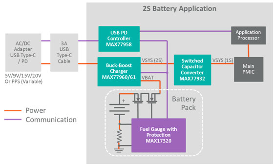 另一個必須考慮的因素是使用大容量電池,高耗電的終端設備需要這些電池來維持更長的運行時間。相比于1S電池,2S電池可以在不增加充電電流的情況下增大容量。由于USB-C支持5V到 20V之間的輸入電壓,而2S或3S電池的電壓介于這兩者之間,因此借助降壓-升壓轉換器可以彌補這一差距。圖2給出了基于2S電池應用的示意流程圖。