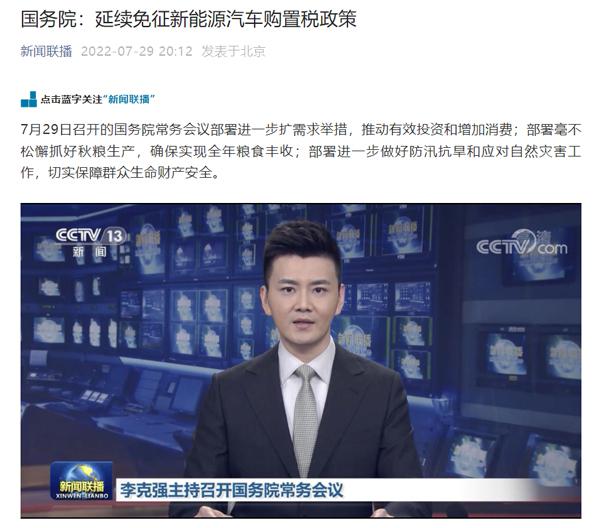 據(jù)新聞聯(lián)播官微消息,7 月 29 日召開的國務(wù)院常務(wù)會議指出,除個別地區(qū)外,限購地區(qū)要增加汽車指標(biāo)數(shù)量、放寬購車資格限制。打通二手車流通堵點(diǎn)。延續(xù)免征新能源汽車購置稅政策。
