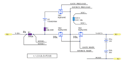SQJQ160E汽車用N溝道MOSFET并聯(lián)連接,使得通路阻抗最小化,以降低功耗。在200A工作條件下,可將總功耗限制在10W以內(nèi)。