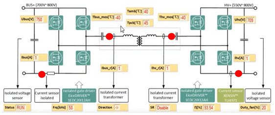 下圖為某雙向DC-DC電源模塊示意圖,圖中紅色圓圈●標識位置均為電流測量傳感器,配合電壓測量傳感器以實現(xiàn)實時功率、效率等參數(shù)的精確測量。