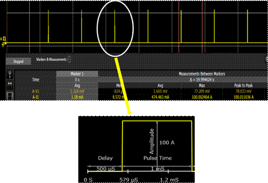 在對分流器測試過程中,為了避免持續(xù)大電流導致被測產(chǎn)品的溫升,APS先進電源系統(tǒng)輸出100A,1mS電流脈沖,通過設(shè)置占空比,平均電流僅僅474mA。如下圖: