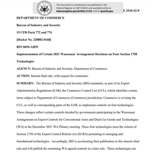 根據(jù)公報(bào), 美國(guó)工業(yè)與安全局決定對(duì)《商務(wù)部管制清單》(CCL)和《出口管理?xiàng)l例》(EAR)同步實(shí)施修訂,對(duì)四項(xiàng)技術(shù)實(shí)施管制。
