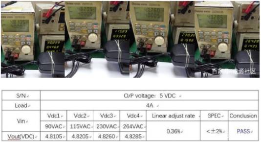 實(shí)測(cè)一個(gè)5V4A適配器計(jì)算下,輸出滿載4A,輸入AC電壓從90Vac到264Vac變化時(shí)輸出變化值