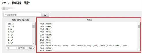在Digi-Key網(wǎng)站,可以根據(jù)參數(shù)來篩選合適的Digi-Key LDO,其中包括直接通過PSRR (電源抑制比) 來篩選的功能。
