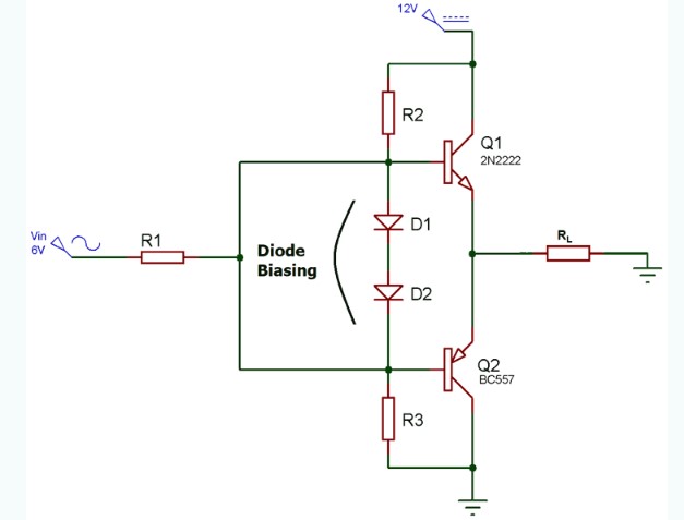 可以看出,AB類放大器挽放電路實(shí)際上上A類和B類放大器的組合。通過(guò)添加二極管,即使在基極端沒(méi)有信號(hào)的情況下,晶體管也被偏置在輕微的導(dǎo)通狀態(tài),從而消除了交叉失真問(wèn)題。