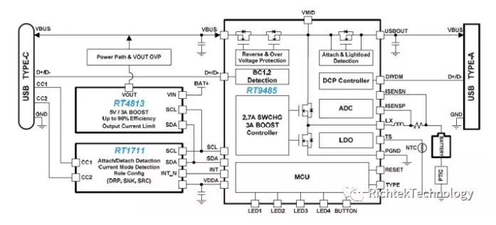 在探索 USB Type-C 接口移動(dòng)電源解決方案的過(guò)程中,立锜曾經(jīng)設(shè)計(jì)過(guò)一種各部獨(dú)立的解決方案,如下圖所示(僅供參考,不要考慮用它):