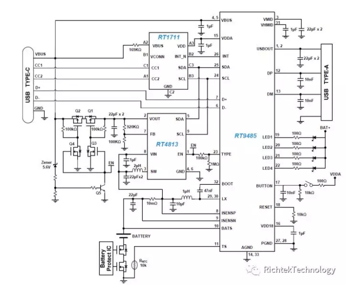 其中的 RT9485 是一款獨(dú)立的移動(dòng)電源芯片(現(xiàn)在沒有對(duì)外銷售),可以 Buck 模式為電池充電,也可以 Boost 模式為外部設(shè)備供電,內(nèi)含 MCU 可以操控所有的事情。當(dāng)需要通過(guò) USB Type-C 接口對(duì)外供電的時(shí)候,Boost 轉(zhuǎn)換器 RT4813 進(jìn)入工作狀態(tài),其輸出用電子開關(guān)接入 VBUS,完成對(duì)外供電的功能。RT1711 是 USB Type-C 接口控制器和 PD 協(xié)議處理器,它是使得這樣組合起來(lái)的系統(tǒng)能符合 PD 標(biāo)準(zhǔn)要求的必要部分。整個(gè)系統(tǒng)的電路如下圖所示: