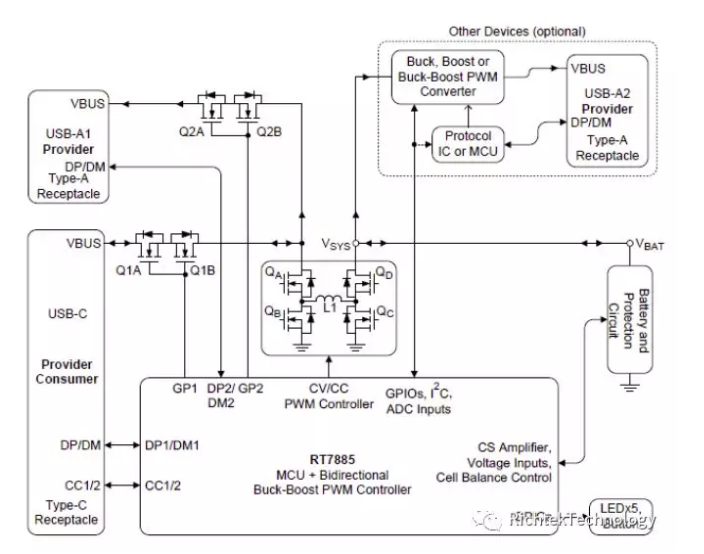 關(guān)于芯片細(xì)節(jié)的東西我們就不進(jìn)一步涉及了,那是從事專業(yè)工作的人才真正關(guān)心的,這樣的人一定要去看規(guī)格書(文末的閱讀原文可以直接抵達(dá)),現(xiàn)在讓我們一起欣賞一下由 RT7885 構(gòu)成的系統(tǒng)框圖: