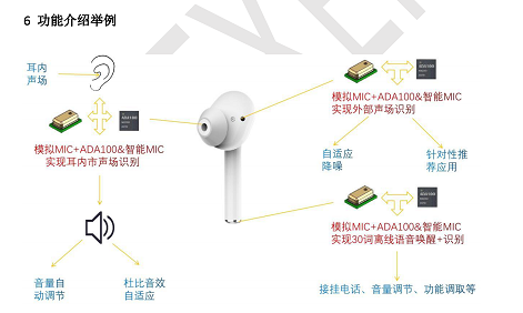 將麥克風(fēng)的模擬mic與ADA100相結(jié)合可以對(duì)于耳內(nèi)的聲場(chǎng)進(jìn)行識(shí)別,從而實(shí)現(xiàn)音量和音效的自適應(yīng)調(diào)節(jié);對(duì)于外部聲場(chǎng)也能進(jìn)行識(shí)別,從而做出自適應(yīng)降噪,降低降噪消耗的功耗,提升續(xù)航時(shí)間;ADA100還擁有30個(gè)關(guān)鍵詞的識(shí)別,可以通過語(yǔ)音控制來進(jìn)行電話的接掛、音量大小的調(diào)控、音樂的切換等人機(jī)交互功能,更加的快速便捷。