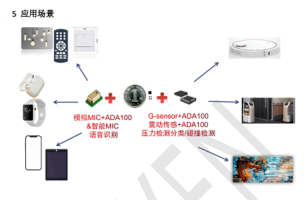 ADA100搭配麥克風(fēng)可以應(yīng)用到許多智能設(shè)備上,例如TWS耳機(jī)、智能手環(huán)、手機(jī)和平板電腦的人工智能助手、智能遙控器、智能開關(guān)、智能家居等,使用場(chǎng)景相當(dāng)廣泛。