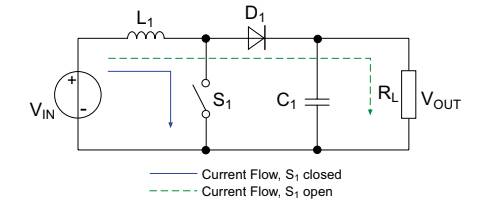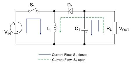 升壓轉(zhuǎn)換器是一種DC/DC開(kāi)關(guān)電源,將非穩(wěn)壓的直流輸入電壓升高以達(dá)到穩(wěn)定的高輸出電壓。與降壓轉(zhuǎn)換器相似,升壓轉(zhuǎn)換器依靠電感器、二極管、電容器和開(kāi)關(guān)管來(lái)調(diào)節(jié)輸出電壓,但是它們的配置方式不同。下面的簡(jiǎn)化電路圖展示了升壓轉(zhuǎn)換器開(kāi)關(guān)期間的電流路徑。