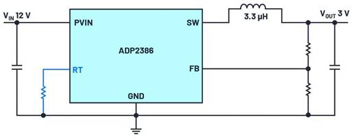 圖 1. ADP2386 降壓變換器,其開關(guān)頻率由電阻 RT 設(shè)置。