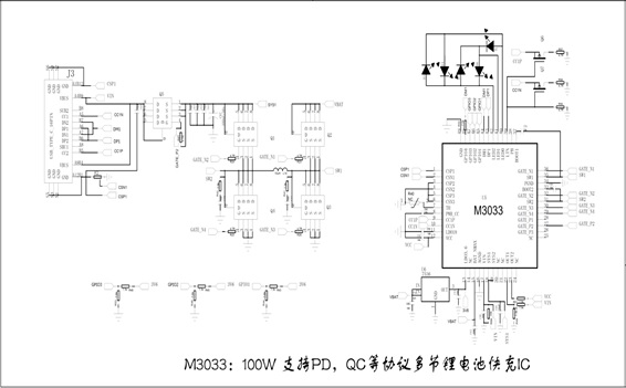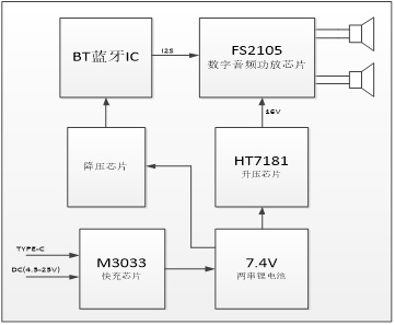 (一)整體方案設(shè)計電源采用兩節(jié)鋰電串聯(lián)供電,充電芯片采用M3033;M3033是一款內(nèi)置PD2.0/QC2.0等快充協(xié)議的多節(jié)100W升降壓鋰電充電管理芯片,工作電壓范圍 4.5-25V、可支持2-7串鋰電快速充電。現(xiàn)在隨著音箱功率越做越大,為保證續(xù)航時間而加大電池容量,戶外藍牙音箱很多采用兩串多并,傳統(tǒng)的充電管理芯片充電過程過于漫長,M3033能實現(xiàn)大容量鋰電池組快速充電。直接使用Type-C充電,無需專用適配器、避免資源浪費。