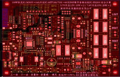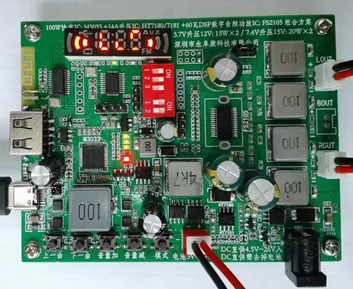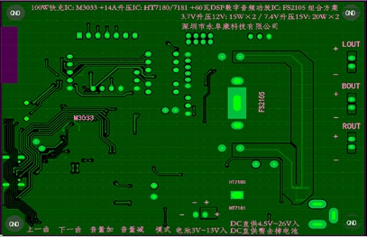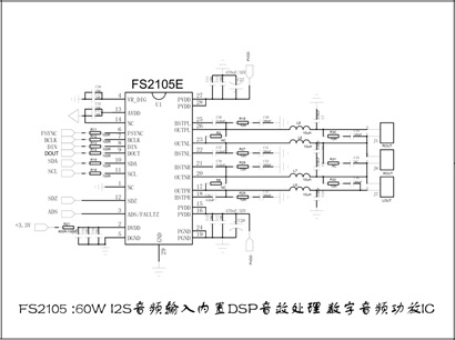 (三)音頻放大部分采用FS2105,15V供電輸出2*20W/4歐(THD+1%);FS2105E是一款集成傅里葉FS Techno音效算法的雙通道中功率音頻放大芯片,最高支持2x30W立體聲BTL或60W單聲道PBTL輸出。相比較傳統(tǒng)模擬輸入的音頻功放,在底噪、信噪比等方面優(yōu)勢明顯;內(nèi)置15段EQ調(diào)節(jié)及三段DRC,簡潔的調(diào)音軟件界面工程師容易上手,實現(xiàn)完美的音質(zhì)輸出。