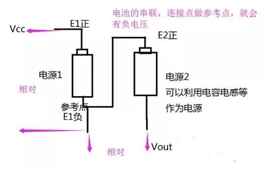 想產(chǎn)生負(fù)電壓,就讓他相對(duì)于電源負(fù)極的電勢(shì)更低即可。要想更低,必須有另一個(gè)電源的介入,根本原理都是利用兩個(gè)電源的串聯(lián)。電源2正極串聯(lián)在參考電源1的負(fù)極后。電源2負(fù)極就是負(fù)電壓了。