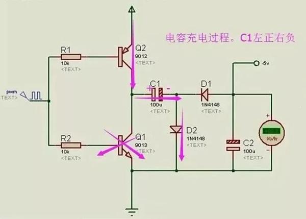 當(dāng)PWM為低電平時(shí),Q2關(guān)閉,Q1打開(kāi),C1開(kāi)始放電,放電回路是C1-C2-D1,這實(shí)際上也是對(duì)C2進(jìn)行充電的過(guò)程。C2充好電后,下正上負(fù),如果VCC的電勢(shì)為5點(diǎn)幾伏,就可以輸出-5V的電壓了。