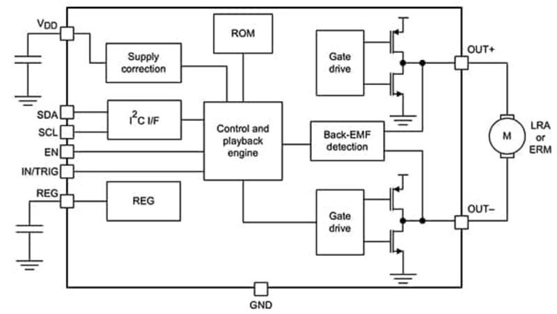 圖 4:DRV2605L IC 可以驅(qū)動(dòng) LRA 或 ERM 觸感器件。(圖片來源:Texas Instruments)