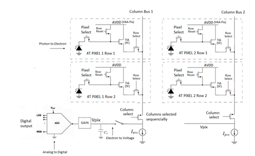 現(xiàn)有多種不同的像素晶體管設(shè)計,包括三晶體管(3T)、四晶體管(4T)和五晶體管(5T)版本。在4T布局中,光電二極管將接收到的可見光子轉(zhuǎn)換為電荷。每個電壓一次讀取一行并放入柱狀電容器(C)中。然后使用解碼器和多路復(fù)用器進(jìn)行讀取。