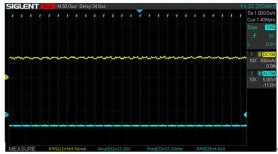 黃色曲線表示通過電機(jī)線圈的電流,青色線表示正在接通/斷開的電壓.該測量是在待機(jī)期間進(jìn)行的,此時(shí)電機(jī)不旋轉(zhuǎn),但保持其位置.電流幾乎是恒定的,電壓有規(guī)律地在短時(shí)間內(nèi)打開,然后再關(guān)閉.請注意,這種切換正在發(fā)生超過30000次每秒!