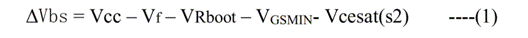 當(dāng)下管S2導(dǎo)通,Vs電壓低于電源電壓(Vcc)時(shí)自舉電容(Cboot)每次都被充電。自舉電容僅當(dāng)高端開關(guān)S1導(dǎo)通的時(shí)候放電。自舉電容給高端電路提供電源(VBS)。首先要考慮的參數(shù)是高端開關(guān)處于導(dǎo)通時(shí),自舉電容的最大電壓降。允許的最大電壓降(Vbs)取決于要保持的最小柵極驅(qū)動電壓。如果VGSMIN最小的柵-源極電壓,電容的電壓降必須是: