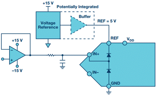 這些方法可解決輸入過驅(qū)的問題,但代價是ADC的輸入擺幅和范圍受限,因為放大器存在上裕量和下裕量要求。通常,軌到軌輸出放大器可在電軌十幾mV內(nèi),但也必須考慮輸入裕量要求,可能為1 V或更高,這會將擺幅進(jìn)一步限制在緩沖器和單位增益配置內(nèi)。該方法提供了最簡單的解決方案,因為不需要額外保護(hù)元件,但依賴正確的電源電壓,可能還需要軌到軌輸入/輸出(RRIO)放大器。