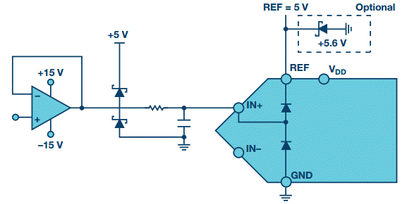在此情況中,之所以選擇肖特基二極管,是因為其具有低正向?qū)▔航,可在ADC內(nèi)的內(nèi)部保護(hù)二極管之前開啟。如果內(nèi)部二極管部分開啟,肖特基二極管后的串聯(lián)電阻也有助于將電流限制在ADC內(nèi)。對于額外保護(hù),如果基準(zhǔn)電壓源沒有/幾乎沒有灌電流能力,則可在基準(zhǔn)節(jié)點(diǎn)上采用齊納二極管或箝位電路,以保證基準(zhǔn)電壓不被過度拉高。在圖2中,為5V基準(zhǔn)電壓源使 用了5.6V齊納二極管。