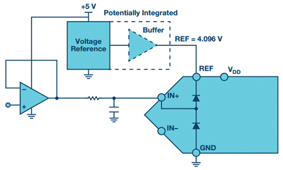 完全消除過壓問題的一種方式是為放大器使用單電源電軌。這意味著,只要為基準(zhǔn)電壓(最大輸入電壓)使用相同電源電平(本例中為5V),驅(qū)動放大器就絕不會擺動至地電壓以下或最大輸入電壓以上。如果基準(zhǔn)電路具有足夠的輸出電流和驅(qū)動強(qiáng)度,則可直接用來為放大器供電。圖5中顯示了另一種可能性,也就是使用略低的基準(zhǔn)電壓值(例如,使用5 V電軌時為 4.096 V),從而顯著降低電壓過驅(qū)能力。