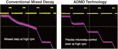 采用高級動態(tài)混合衰減(ADMD)技術(shù),動態(tài)調(diào)整混合衰減比例,優(yōu)化步進(jìn)電機高速電流驅(qū)動。如下圖所示,在高速電流驅(qū)動狀態(tài)下,傳統(tǒng)的方式可能會發(fā)生失步現(xiàn)象(圖左),而ADMD則可以實現(xiàn)精準(zhǔn)的控制(圖右)。采用ADMD技術(shù)能夠?qū)崿F(xiàn)更緊密的輸入電流跟蹤,從而進(jìn)一步強化了高轉(zhuǎn)速條件下的高效電機控制。
