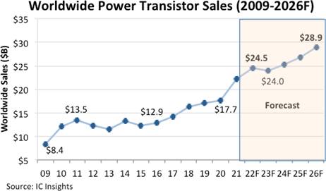 據(jù)半導體市場研究機構IC insights最新公布的數(shù)據(jù)顯示,2022年全球功率半導體的銷售額預計將同比增長11%,達到245億美元,實現(xiàn)連續(xù)第六年的增長,達到創(chuàng)紀錄的歷史最高水平。
