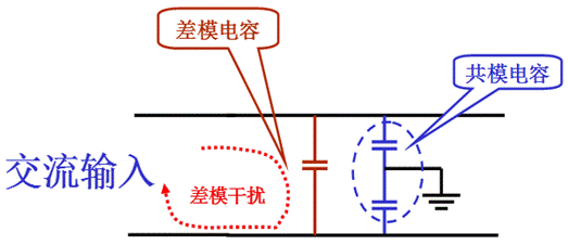 在電路中引入共模電容,則共模電容提供最短的路徑使共模干擾信號被旁路,從而抑制共模干擾的產(chǎn)生。如果電源回路同時還存在差模干擾,使用差模電容來抑制干擾。
