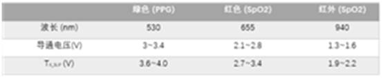 目前,大多數(shù)智能手表及智能手環(huán)都具有生物信息檢測的功能,該功能通常需要光學生物傳感模塊(如AFE4410)來實現(xiàn),綠光用于心率檢測,紅光或紅外光則用于血氧飽和度檢測,發(fā)出不同顏色光的LED導通電壓也有差異,如下表