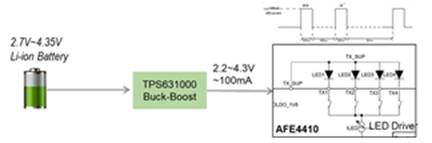 首先,TPS631000的基本參數(shù)(TPS631000數(shù)據(jù)表)可以滿足該應用的需求,當輸入電壓近似等于輸出電壓時,TPS631000 會自動以升壓、降壓或 3 周期降壓/升壓模式運行。它還能夠以定義的占空比進行模式切換,避免不必要的模式內切換,以減少輸出電壓紋波。生物傳感模塊一般不會持續(xù)工作,多數(shù)設計是間隔一定時間運行一次,因此,大部分時間該模塊會處于待機狀態(tài),TPS631000的靜態(tài)電流僅為8 µA,因此可在輕載條件下實現(xiàn)出色效率,最大限度減少不必要的電能損耗以延長待機時間。此外,TPS631000提供小尺寸解決方案,采用 1.2mm × 2.1mm SOT-583 封裝、一個 1µH 電感器和一個 0805 輸出電容器,方便開發(fā)者實現(xiàn)小型化設計。