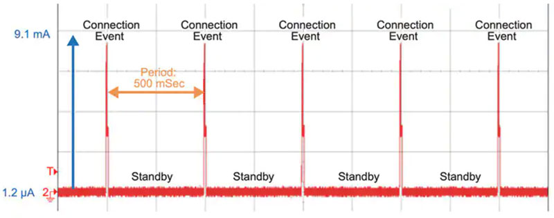 圖 1:對于許多諸如無線鎖之類的無線物聯(lián)網(wǎng)設(shè)備來說,其激活和待機(jī)狀態(tài)下的電流消耗存在很大差異。(圖片來源:Texas Instruments)
