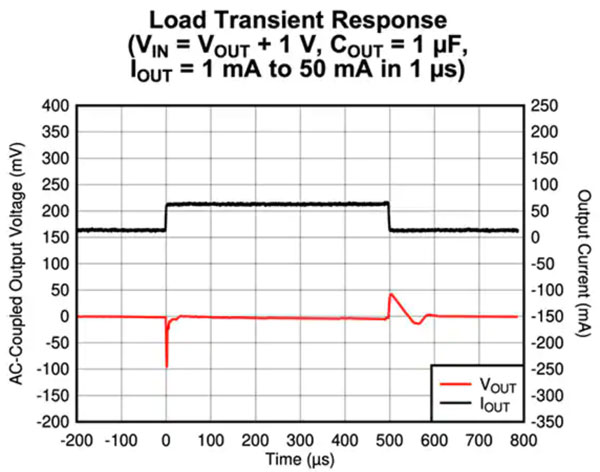 如果快速瞬態(tài)響應(yīng)和低 Iq 對系統(tǒng)有益,則設(shè)計(jì)者可采用 Texas Instruments 的 TPS7A02。該器件的額定電流為 200 mA,Iq 為 25 nA,Id 為 3 nA。該器件支持 0.8 V 至 5.0 V 輸出電壓,可按 50 mV 步長進(jìn)行設(shè)定。該 LDO 的典型瞬態(tài)響應(yīng)少于為 10 μs 建立時(shí)間,且對于從 1 mA 到 50 mA 的階梯式負(fù)載變化,有 100 mV 下沖。如圖 3 所示,其響應(yīng)特性在負(fù)載增加和減少時(shí)不同。TPS7A02 的指定結(jié)溫為 -40°C 至 +125℃。