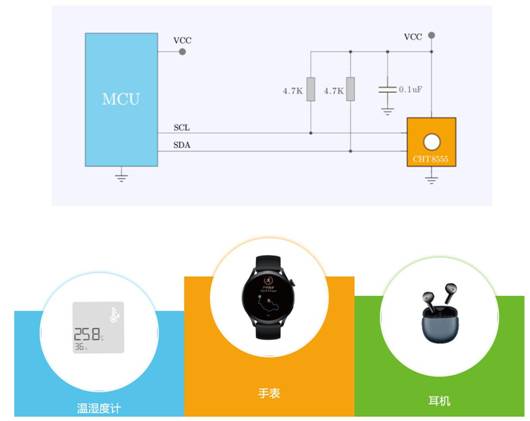 CHT8555在用戶使用時(shí)無(wú)需再次校準(zhǔn),即可保證20~50℃溫度范圍內(nèi)小于±0.1℃的誤差,-40~125℃溫度范圍內(nèi)小于±1.0℃的誤差,20~80%RH濕度范圍內(nèi)小于±3.0%RH的誤差。具有富有競(jìng)爭(zhēng)力的低工作電流,小芯片級(jí)CSP封裝以及低功耗,專為空間有限的產(chǎn)品應(yīng)用所設(shè)計(jì),可廣泛應(yīng)用于便攜式TWS耳機(jī)、手表、手環(huán)等智能穿戴設(shè)備,同樣適用于IoT智能家居、環(huán)境監(jiān)測(cè)器及安防攝像頭等領(lǐng)域。