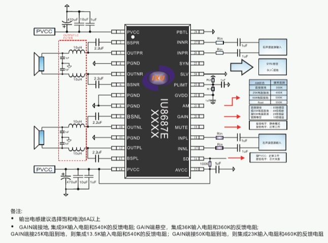 IU8687E是一款2X45W立體聲D類音頻放大器;在供電電壓25V的情況下,負(fù)載為8Ω 的情況下最大可以輸出2X45W的連續(xù)功率,在PBTL模式下最大可以輸出88W(負(fù)載4Ω )的連續(xù)功率;通過主從模式的設(shè)置可以讓IU8687E實(shí)現(xiàn)無限級 聯(lián),從而實(shí)現(xiàn)系統(tǒng)的多路輸出;IU8687E具備先進(jìn)的EMI抑制技術(shù),它采用表面貼裝技術(shù),只需少量的外圍器件,便使系統(tǒng)具備高質(zhì)量的音頻輸出功率。IU8687E內(nèi)置了過流保護(hù),短路保護(hù)和過熱保護(hù),有效的保護(hù)芯片在異常的工作條件下不被損壞。IU8687E最高可達(dá)到95%以上的效率, 35V的耐壓設(shè)計(jì)為芯片提供了超高的可靠性,可以有效的降低生產(chǎn)過程中的不良比例。