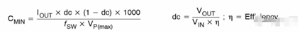 輸入電容的目的是減小輸入紋波,輸入紋波需要控制在75mv(0.5%)以內(nèi)。式中Cmin表示最小輸入電容,單位為uF;Iout表示輸出電流;fsw表示開關(guān)頻率,VP(max)表示輸入的最大峰峰值電壓。