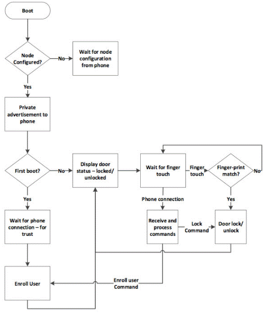 房間控制和監(jiān)控:房間控制節(jié)點(diǎn)允許用戶控制房間內(nèi)的照明、恒溫器和其他電器。它們還可以監(jiān)控環(huán)境參數(shù),如溫度、濕度。這些節(jié)點(diǎn)可以通過智能手機(jī)和/或節(jié)點(diǎn)中存在的本地控件進(jìn)行控制。例如,圖3所示的系統(tǒng)包括兩個(gè)光控制節(jié)點(diǎn)和一個(gè)溫度監(jiān)測(cè)節(jié)點(diǎn)。此外,光控制節(jié)點(diǎn)支持基于用戶識(shí)別的智能控制。例如,可以將節(jié)點(diǎn)配置為在使用經(jīng)過身份驗(yàn)證的指紋解鎖房屋門時(shí)打開燈。同樣,當(dāng)有人離開時(shí),當(dāng)門被鎖上時(shí),燈可以關(guān)閉。