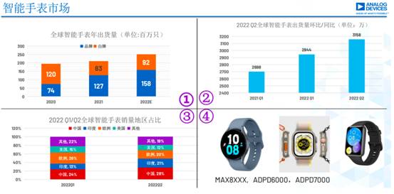 智能手表行業(yè)是近幾年少有的在消費(fèi)類市場(chǎng)上持續(xù)保持穩(wěn)步上升的。從2020年到2022年,總出貨量呈兩位數(shù)增長(zhǎng),品牌占比也有所增長(zhǎng)。中國智能手表市場(chǎng)份額占28%,位居榜首,歐、美在下降,印度在上升。從中可以看出國人對(duì)智能手表包括對(duì)健康的領(lǐng)域關(guān)注程度很高。