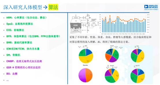 ADI的傳感器分為兩大部分:一是光路部分。通過血管收縮膨脹產(chǎn)生的變化,對(duì)反射光采集信息做出判斷,可用于采集心率信息。這個(gè)部分極具難度,因?yàn)槊總(gè)人胖瘦不同,手表佩戴的松緊不同,膚色不同,包括體毛、紋身、傷疤等因素都能影響采集精準(zhǔn)度。ADI在模擬領(lǐng)域深耕近60年,能提供極高的信噪比,保證信號(hào)質(zhì)量和可測(cè)覆蓋度。在不同情況下,比如漏光、環(huán)境光的干擾、動(dòng)態(tài)光的偽像,ADI也可以提供一整套方案進(jìn)行動(dòng)態(tài)干擾抑制,可適配更多的環(huán)境、測(cè)試狀態(tài)。此外,ADI還提供穩(wěn)定的算法,自適應(yīng)的算法,以及應(yīng)用機(jī)器學(xué)習(xí)的理論。