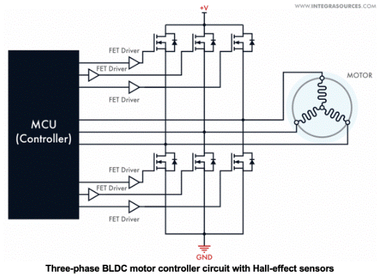 BLDC 電機(jī)控制器使用半 H 橋電路的晶體管切換電流。晶體管的數(shù)量取決于控制器激勵的相數(shù)或繞組數(shù)。三相無刷直流電機(jī)控制器(最常見的配置之一)需要三個(gè)半H橋,即每相一個(gè)高邊和一個(gè)低邊開關(guān)。
